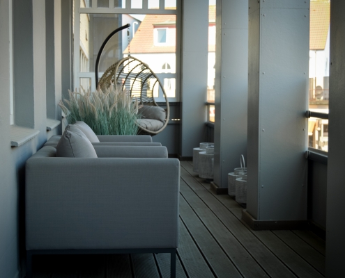 Große Terrasse mit Loungemöbel und einem Hängesessel