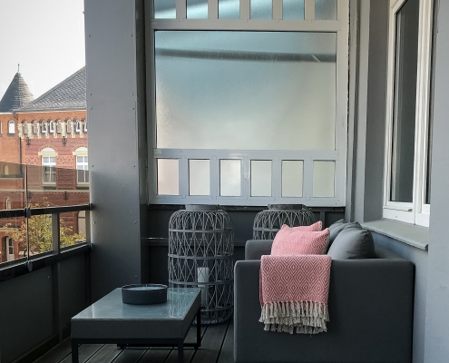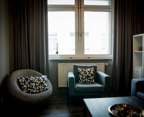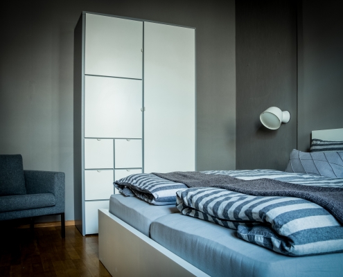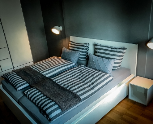 Diese sehr schlicht möbilierte Ferienwohnung mit ca. 62 m2 befindet sich im ersten Stock des Stadthauses. Es gibt zwei Schlafbereiche und einen großzügigen Wohnbereich mit angrenzender Terrasse im Loungestil.
