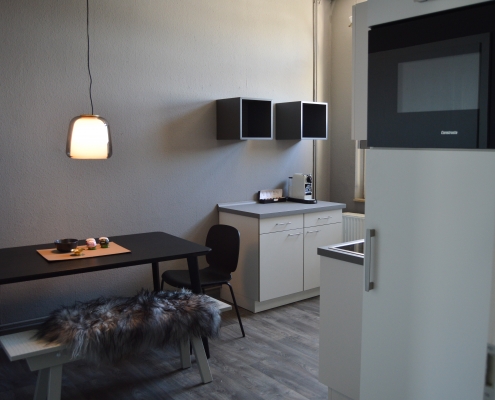 Küche mit Kühlschrank, Herd/Backofen, Spülmaschine, Mikrowelle, Nespressomaschine, Toaster.