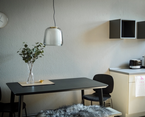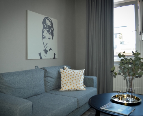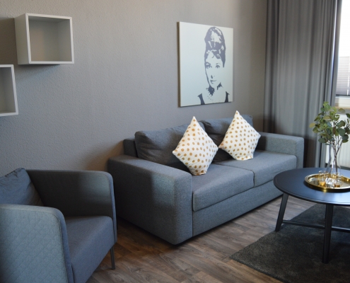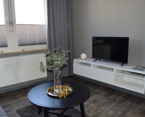 Eine 60qm2 große Ferienwohnung mit klarer Linie. Wenn Sie nach einem langen Tag am Strand ins Haus kommen, lädt das Wohnzimmer zum Ausruhen ein. Nehmen Sie auf dem bequemen Sofa Platz und genießen den Abend in trauter Runde.