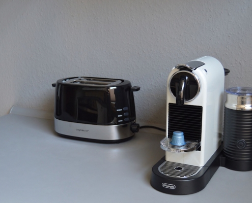 Küche mit Kühlschrank, Herd/Backofen, Spülmaschine, Mikrowelle, Nespressomaschine, Toaster